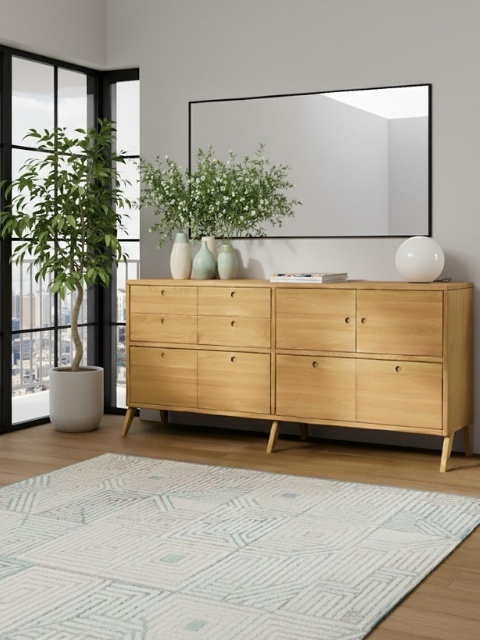 Komoda Arbaro 180 posiada dwie głębokie szuflady umieszczone na dole, dwie płytsze oraz część szafkową z podwójnymi drzwiczkami. Ta wszechstronna konstrukcja zapewnia różnorodne opcje przechowywania dla różnych przedmiotów. Szuflady i drzwiczki zamontowane zostały na prowadnicach i zawiasach Blum z systemem cichego domyku, zapewniającym tym samym delikatne zamykanie i ciche korzystanie z mebla.